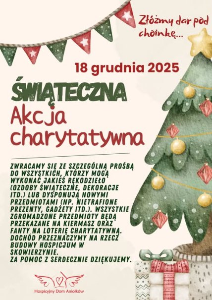 Dnia 18 grudnia 2025 r. zakończyła się szkolna akcja charytatywna, którą była Loteria Fantowa. Celem jej było wsparcie budowy Hospicjum w Skowierzynie. Dzięki ogromnemu zaangażowaniu uczniów, nauczycieli, rodziców oraz wszystkich darczyńców udało się nie tylko zrealizować zaplanowane działania, ale przede wszystkim zebrać środki, które realnie przyczynią się do powstania miejsca niosącego pomoc, opiekę i nadzieję osobom potrzebującym.
